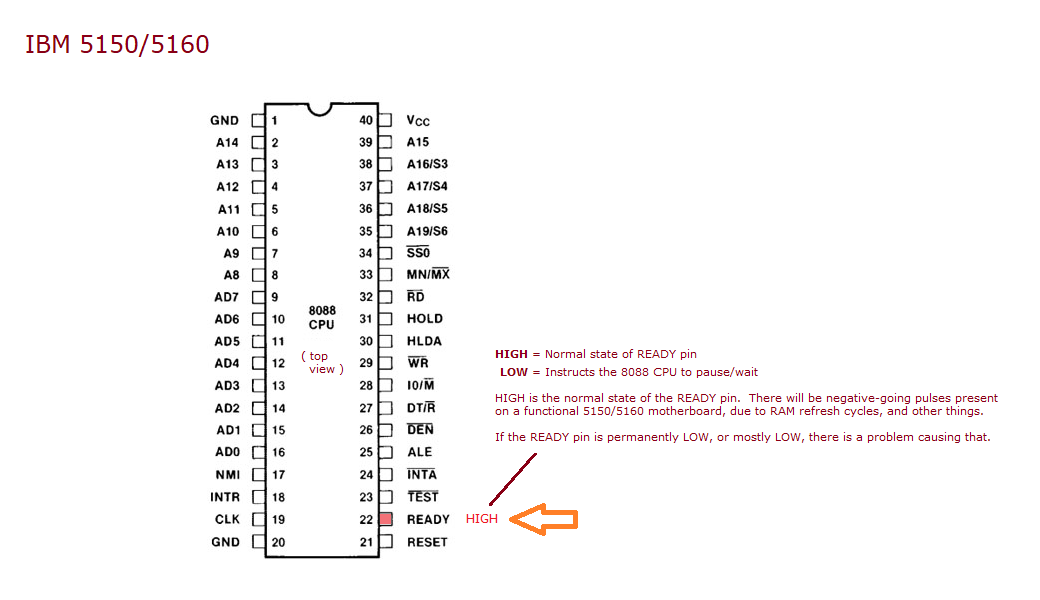 | Step 3.2 | Verify that the READY pin, pin 22, of the 8088 CPU is LOW - see here. If not LOW, use the diagram at here to see if you can work out why it is not LOW. |