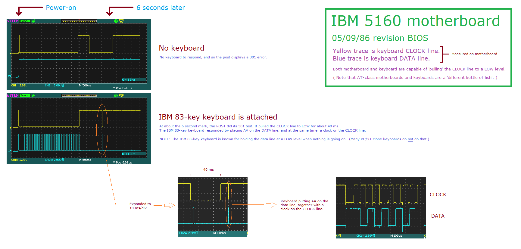 | IF REQUESTED, LOAD DIAG. CODE | Take the clock pin in the motherboard's keyboard DIN connector LOW for 20 ms. (Done by the KBD_RESET subroutine.) If the attached device responds with the byte of EAh, the attached device is an enhanced keyboard. If the attached device responds with the byte of AAh, the attached device is a 'normal' keyboard. If the attached device responds with the byte of 65h, the attached device is a special IBM device that supplies diagnostic code to the 5160 via the keyboard port. If the latter, jump to the routine ('MFG_BOOT') that loads the diagnostic code via the keyboard port, then executes the code. |