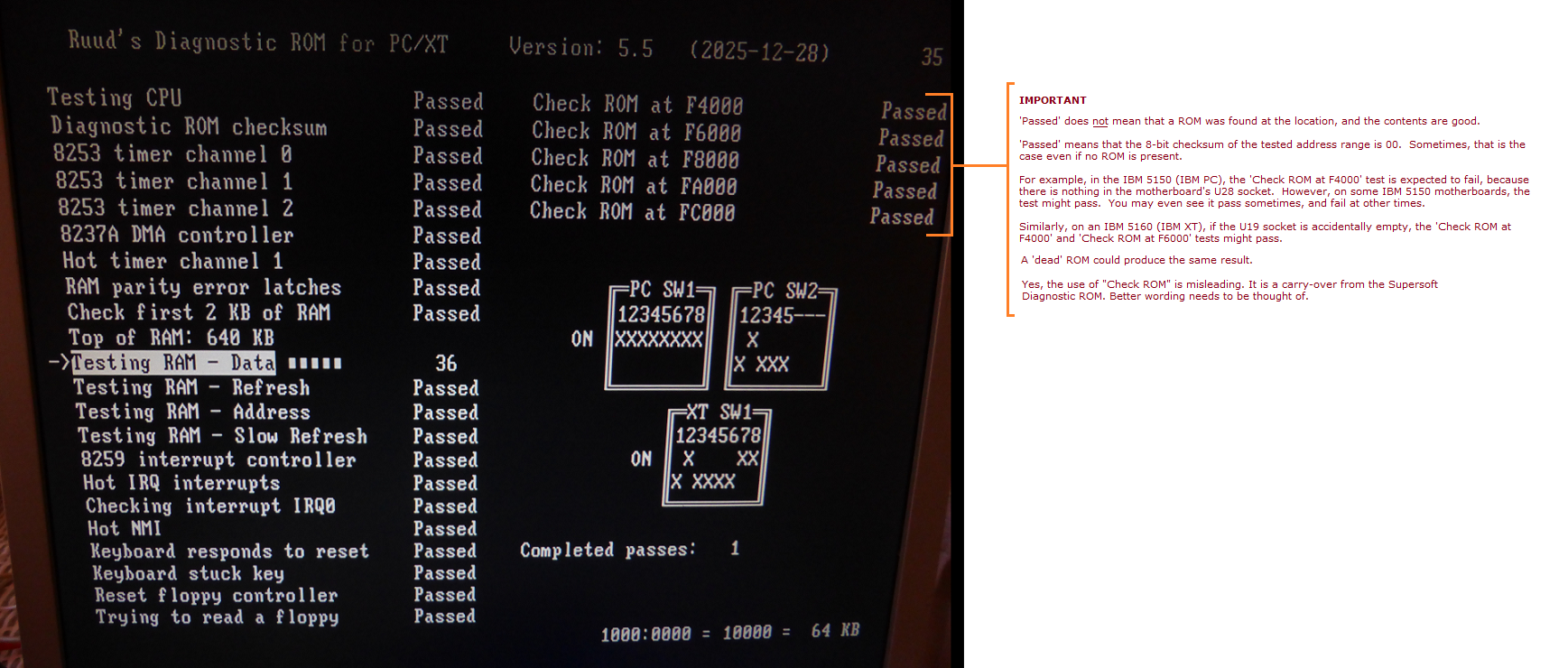 | Note 5 | For most of its work, Ruud's Diagnostic ROM (RDR) needs some RAM for variables and for the stack. The motherboard RAM cannot be trusted (a common use of RDR being because there is bad RAM in bank 0). For that reason, RDR uses either: - If an MDA video card is present, the unused video RAM on that; or - If an CGA video card is present, the unused video RAM on that; or - If 4 KB of RAM at address A0000, some of that RAM. (Version 4.3 or later of RDR required.) - If 4 KB of RAM at address B0000, some of that RAM. - If 4 KB of RAM at address B8000, some of that RAM. |