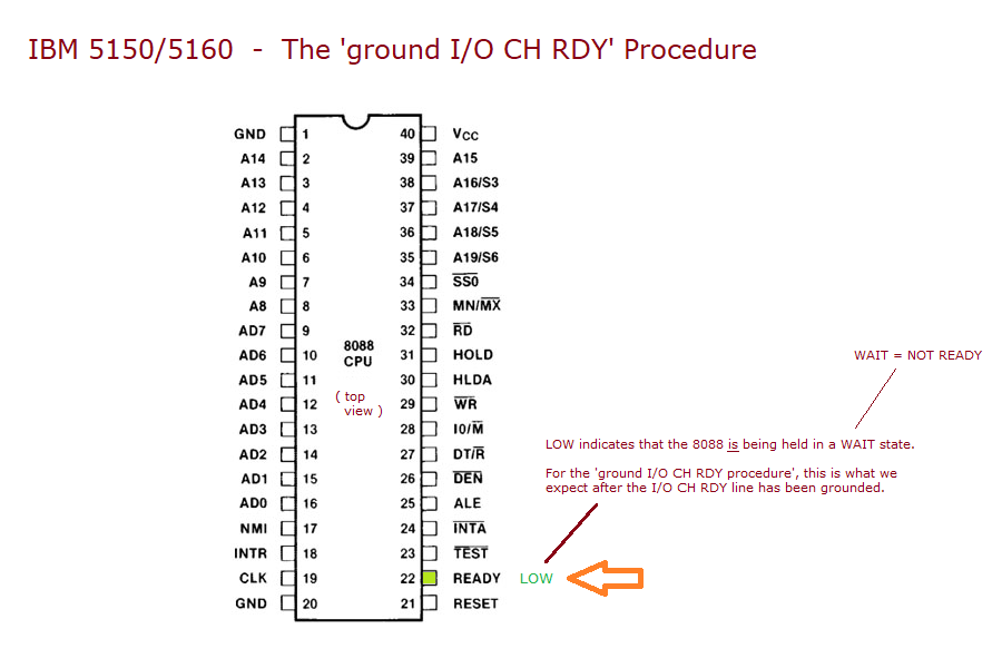 | Step 3.2 | Verify that the READY pin, pin 22, of the 8088 CPU is LOW - see here. If not LOW, use the diagram at here to see if you can work out why it is not LOW. |